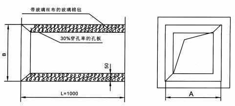• ZWB型消聲彎管是使風管短邊B拐彎90度,并具有一定消聲作用的彎管,其拐彎半徑為風管內壁長邊A,吸聲材料厚為50和100mm。